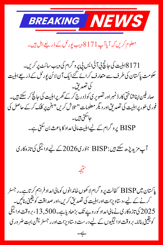 | Eligibility Check | Visit the8171 web portal and enter your CNIC to check the status. |